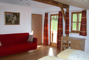 Schlafzimmer mit Balkon, 18 m², Doppelbett mit Nachtkonsolen, Kleiderschrank, Schreibtisch und Bad.